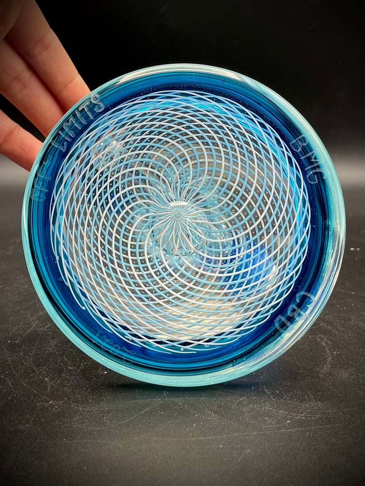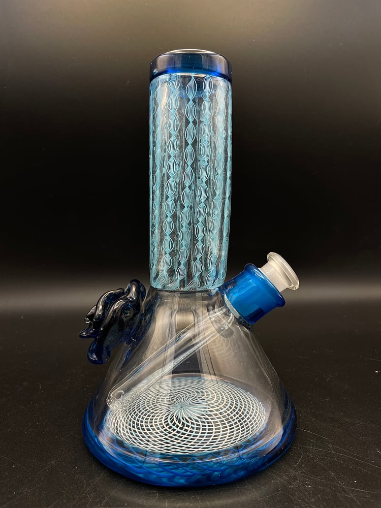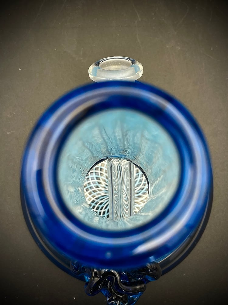This Blue Tube functional piece features a twisty cane neck, a reticello cane section on the bottom, and a blue flower accent on the back to match the color of the joint and lip wrap.