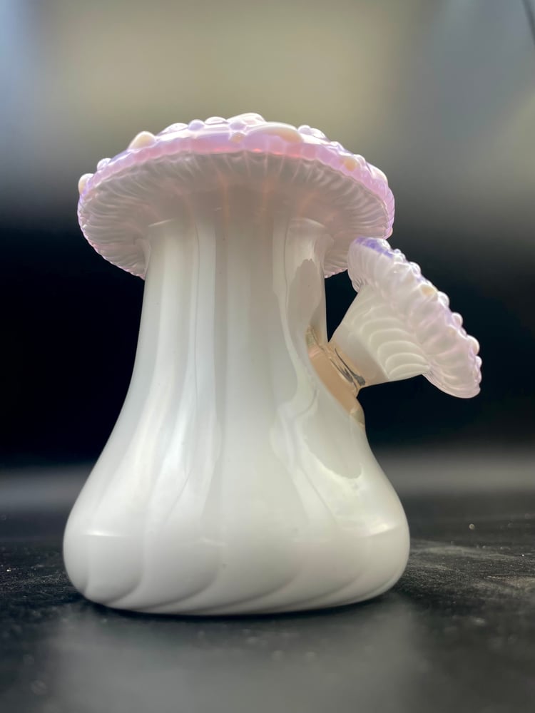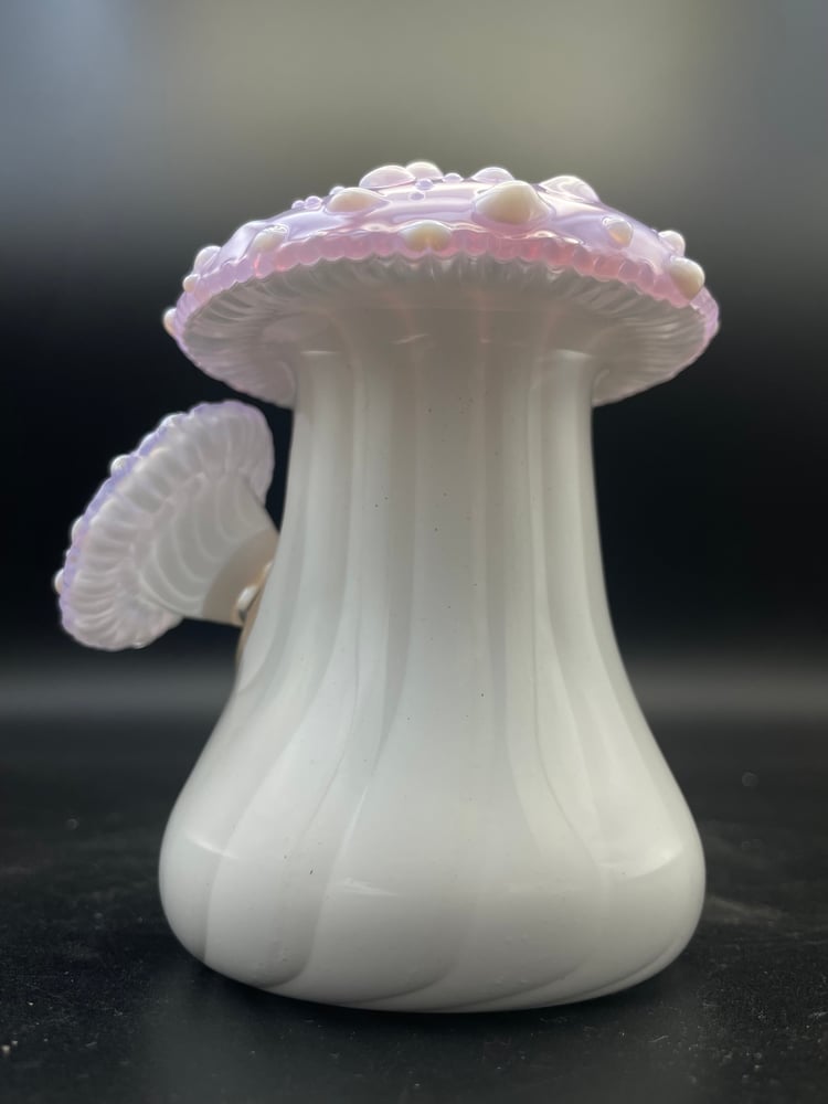 This set features a white striped stem leading into a Lucid colored cap with white dots, and sculptural features including the 'gills' of the mushroom. The removable 14mm slide features a matching color palette & sculptural details with a built in 4 hole screen.