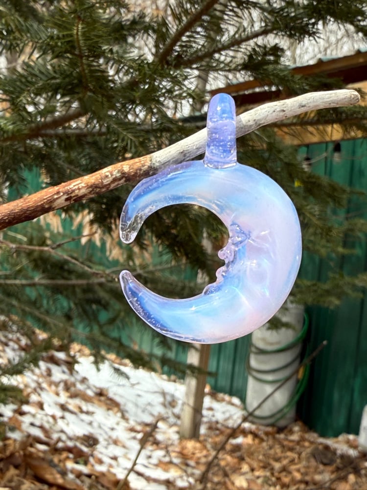 This opalescent moon pendant was handmade and flame worked by Angie (@offlimitsglass) in 2025.