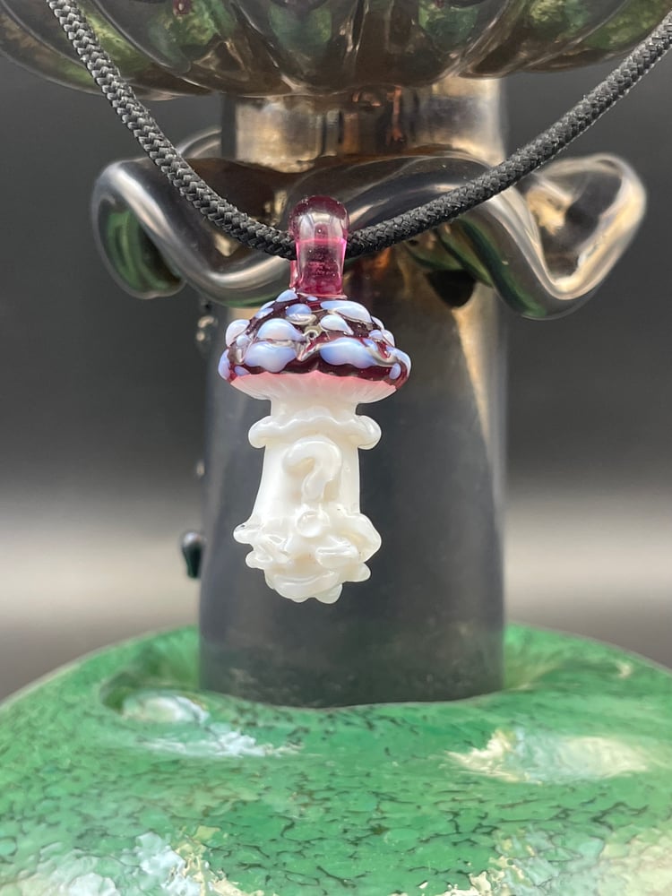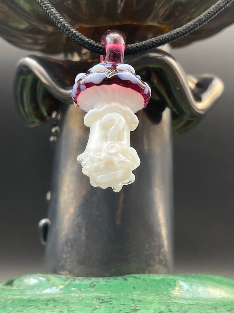 Fabricated on the torch from Lotus White and Phoenix colored borosilicate glass, this small pendant is the perfect one of a kind accessory for a mushroom lover.